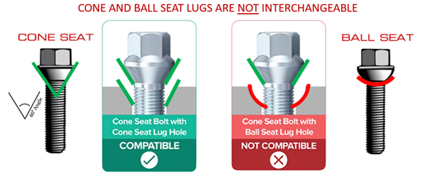 Many European cars use lug bolts to fasten the wheel to the vehicle. Basically, the lug bolt is a combination of the stud and lug nut. It’s important to note that many factory wheels installed with lug bolts use a “radial” or “ball” seat. As stated, most aftermarket wheels are acorn seat and are not compatible with OE lug nuts.