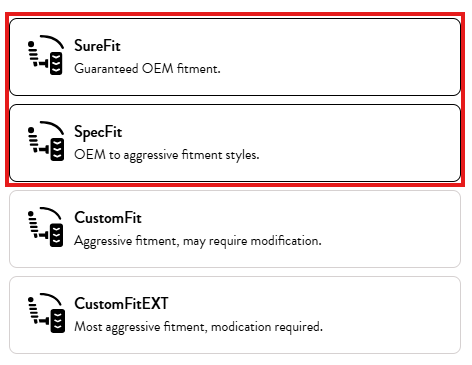 Fitment Factors determine how closely a wheel setup matches factory specifications or how aggressive the stance will look. For the widest range of options that maintain OEM specs, “Sure Fit” and “Spec Fit” are automatically selected by default. If your vehicle is modified, or you want a more aggressive stance, deselect those presets and choose “Custom Fit” or “Custom Fit EXT.”